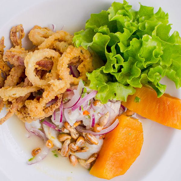De lenguado, marinado en jugo de limas, ajíes, cilantro, cebolla, coronado con chicharrón de calamar, acompañado de batata glaseada y maíz frito.