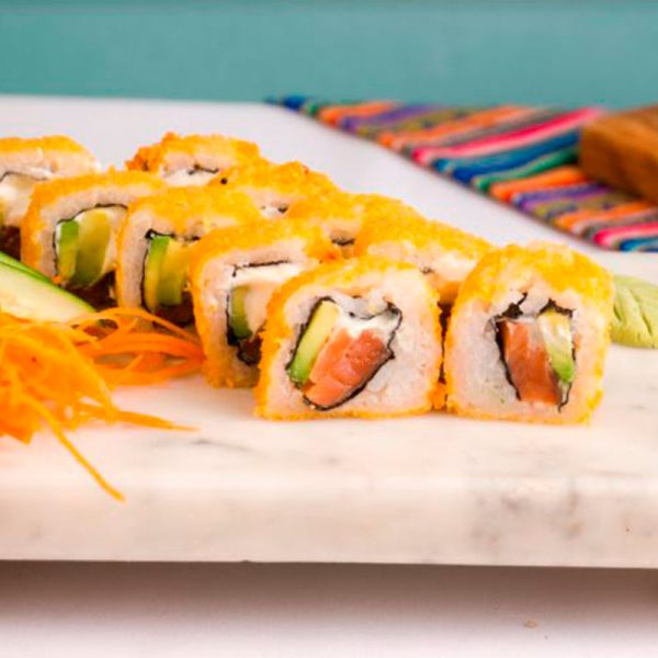 Salmón ahumado, queso crema, palta y empanizado panko.